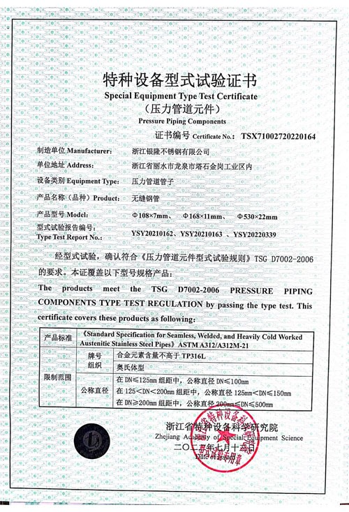 浙江銀隆不銹鋼有限公司創始于2006年,是一家專業生產不銹鋼無縫管的企業。公司位于浙江麗水市,企業注冊總資金貳億壹仟柒佰肆拾玖萬元,擁有4家工廠,占地總面積11萬平方米,職工530人,年產不銹鋼無縫管5萬噸。